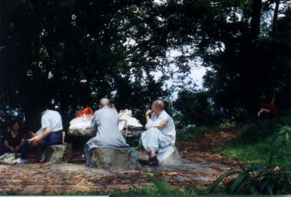 見正師、繼欣師、郭瓊瑤、麗娟與宏洲小朋友,坐在石椅上靜靜的欣賞大自然美景。